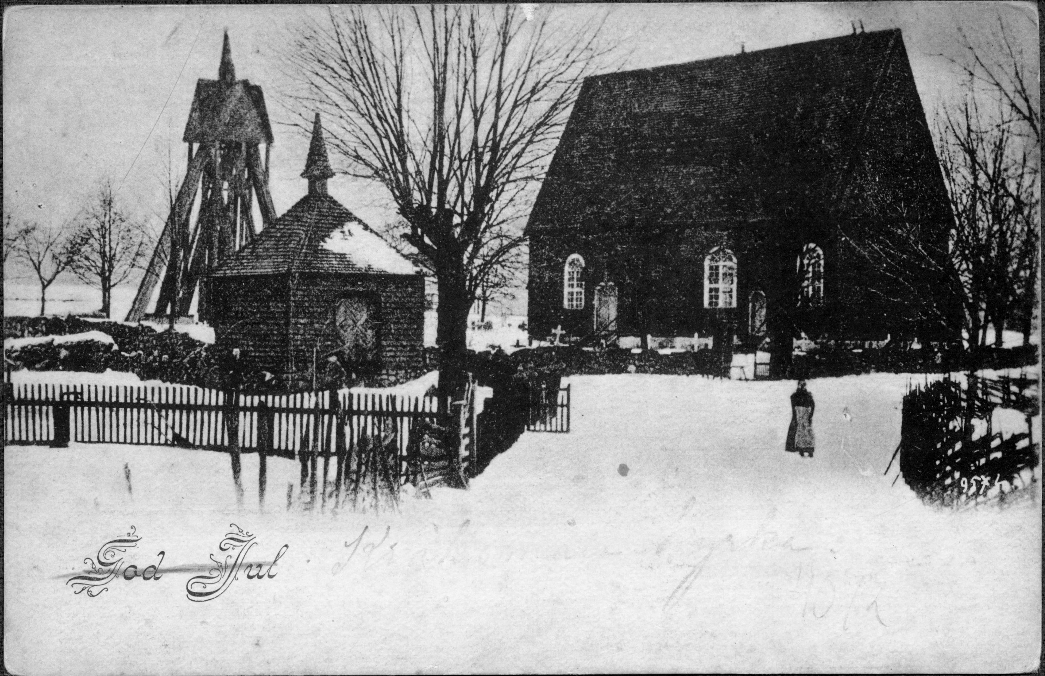 Kyrkan, klockstapeln och stigluckan mot sydöst.