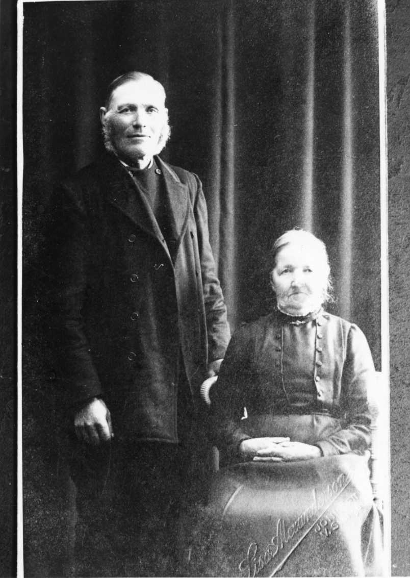 Porträtt av en äldre man och kvinna, kvinnan sitter på en stol.