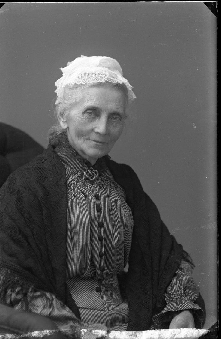 Porträtt av en kvinna som sitter i en fåtölj. Hon bär en mörk virkad sjal och en tunn ljus mössa.