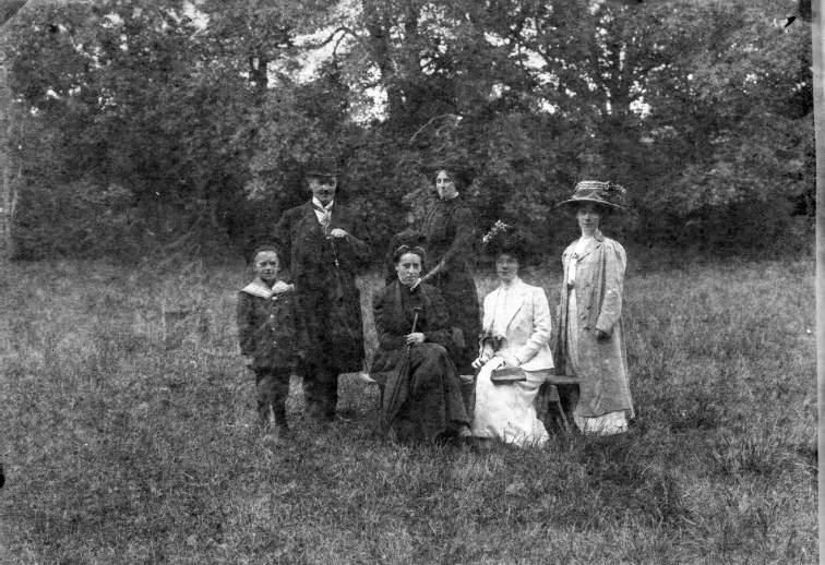 Ett sällskap med fyra kvinnor, en man och en pojke på en gräsplan. Två av kvinnorna sitter på en bänk. En familjegrupp?