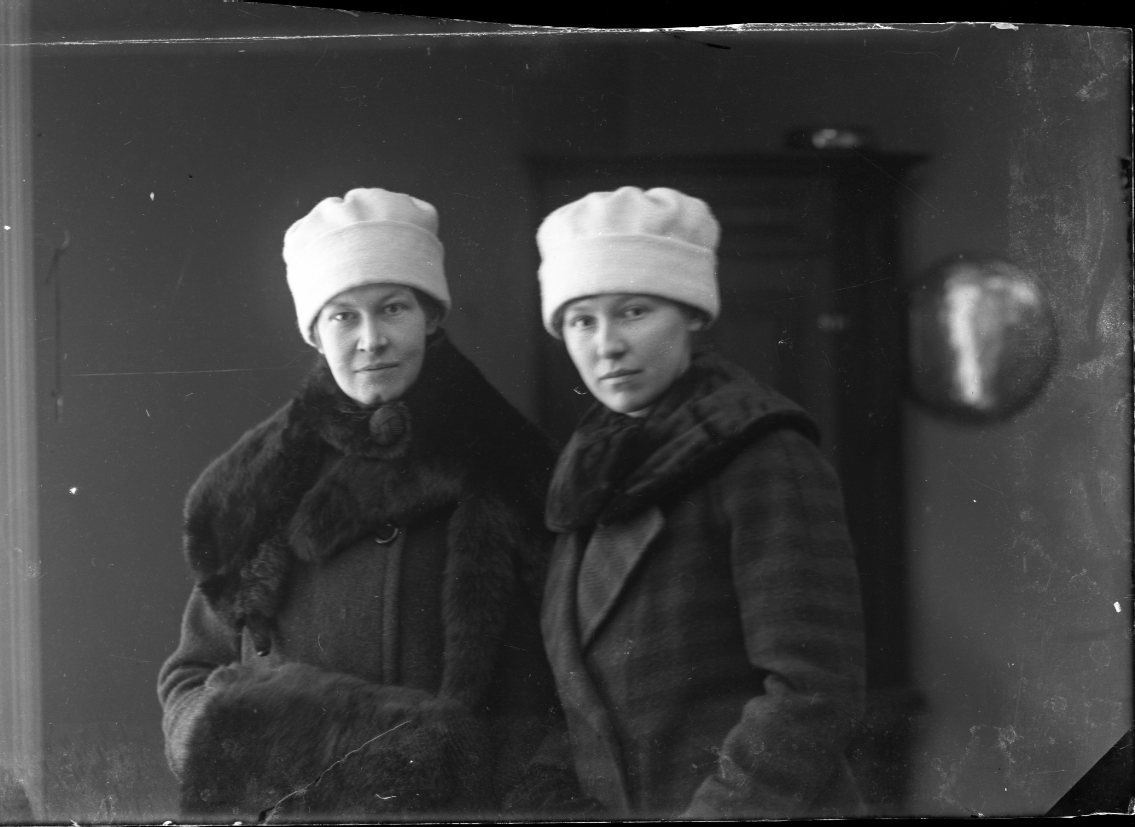 Porträtt av två vinterklädda kvinnor med identiska vita mössor.