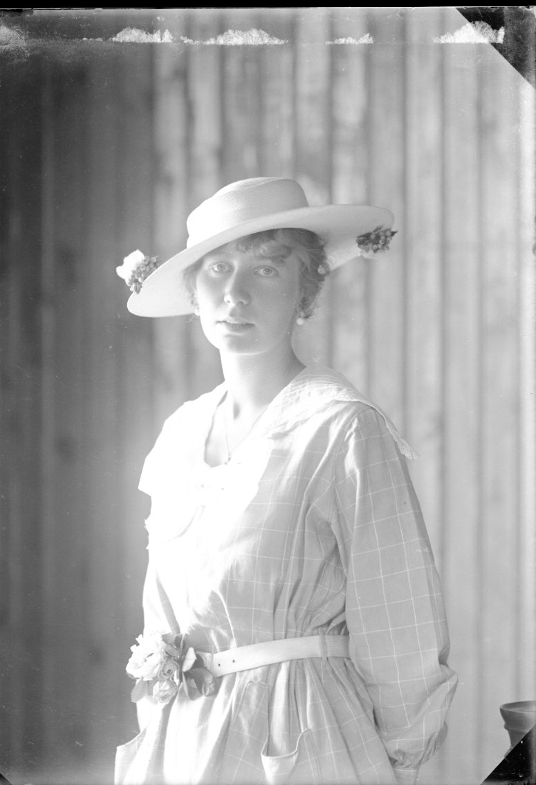 Porträtt av en ung kvinna i ljus rutig klänning och hatt lite på snedden. Solen skiner in från vänster.