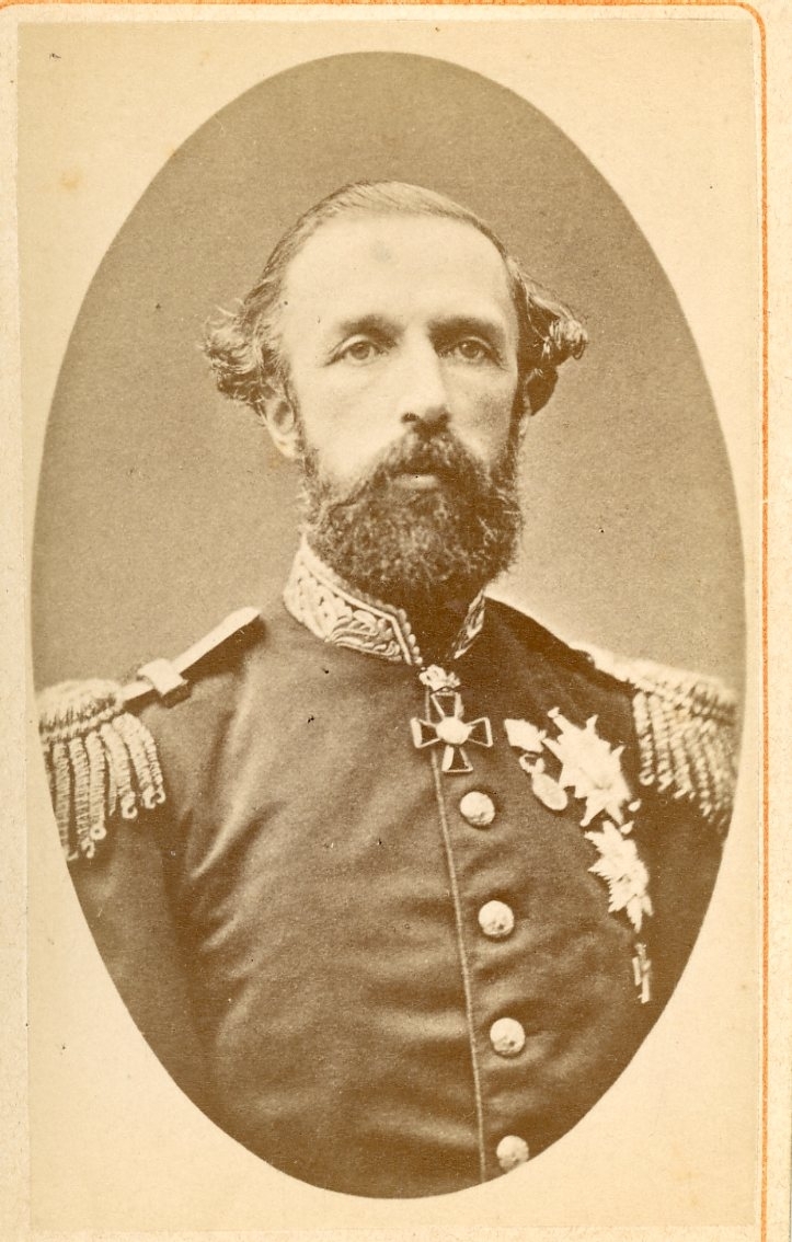 Kabinettsfotografi av en man i militär uniform med epåletter och ordnar på bröstet.