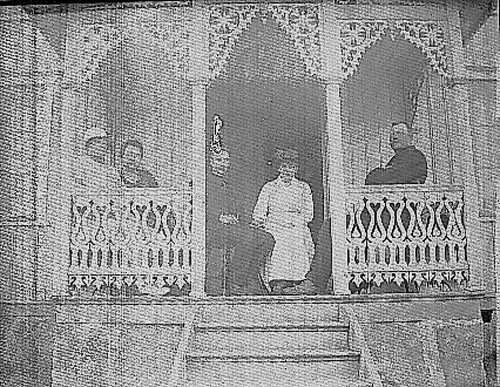 Verandan till snickarmästaren Axel Johansson och hustrun Hanna Ludvigsdotters hem Ängsberg i Siggarp, Ölmstad Personerna på bilden är oidentifierade.