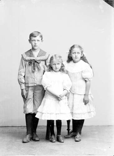 En pojke i sjömanskostym och två flickor i ljusa klänningar med rosetter i håret.