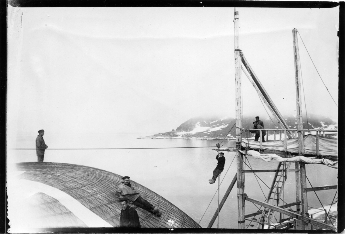 Kontroll av ballongens täthet. De vita linnebanden, indräkta med blyacetat, missfärgades vid läckage. A Stake på väg över till ballongen.