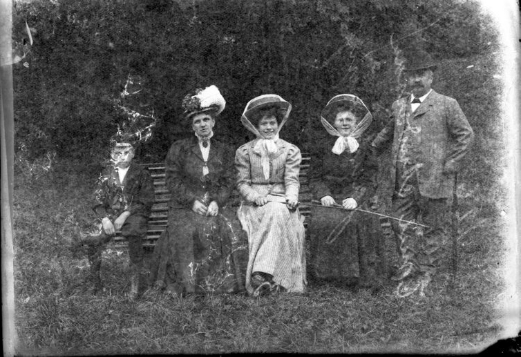 Tre kvinnor med hattar sitter på en bänk. Två av dem har hattband knutet vid halsen. Till vänster på bänken sitter en liten pojk med keps. Till höger står en man med hatt, håller höger hand på bänkens rygg. En familj?