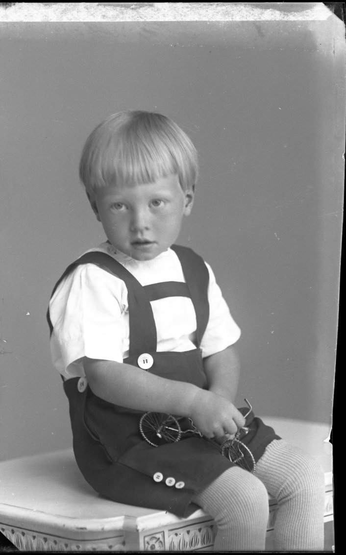 Porträtt av en liten pojke som sitter på en pall. Han har en leksakscykel i händerna.