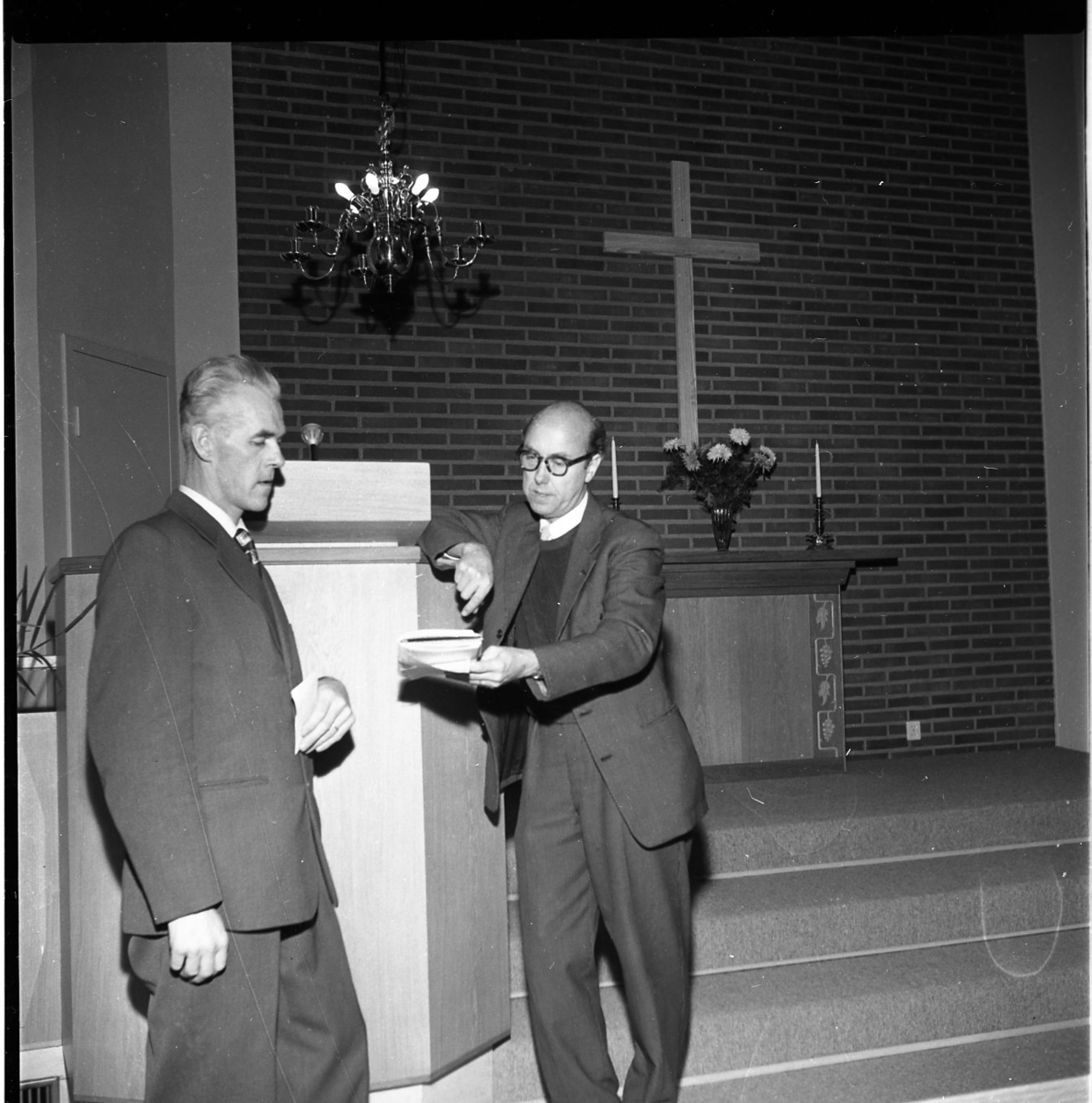 Två män står och hänger mot en talarstol längst fram i en kyrka. Den ena mannen håller fram en bok mot den andra. Bakom dem finns ett altare. På altaret står en bukett blommor.