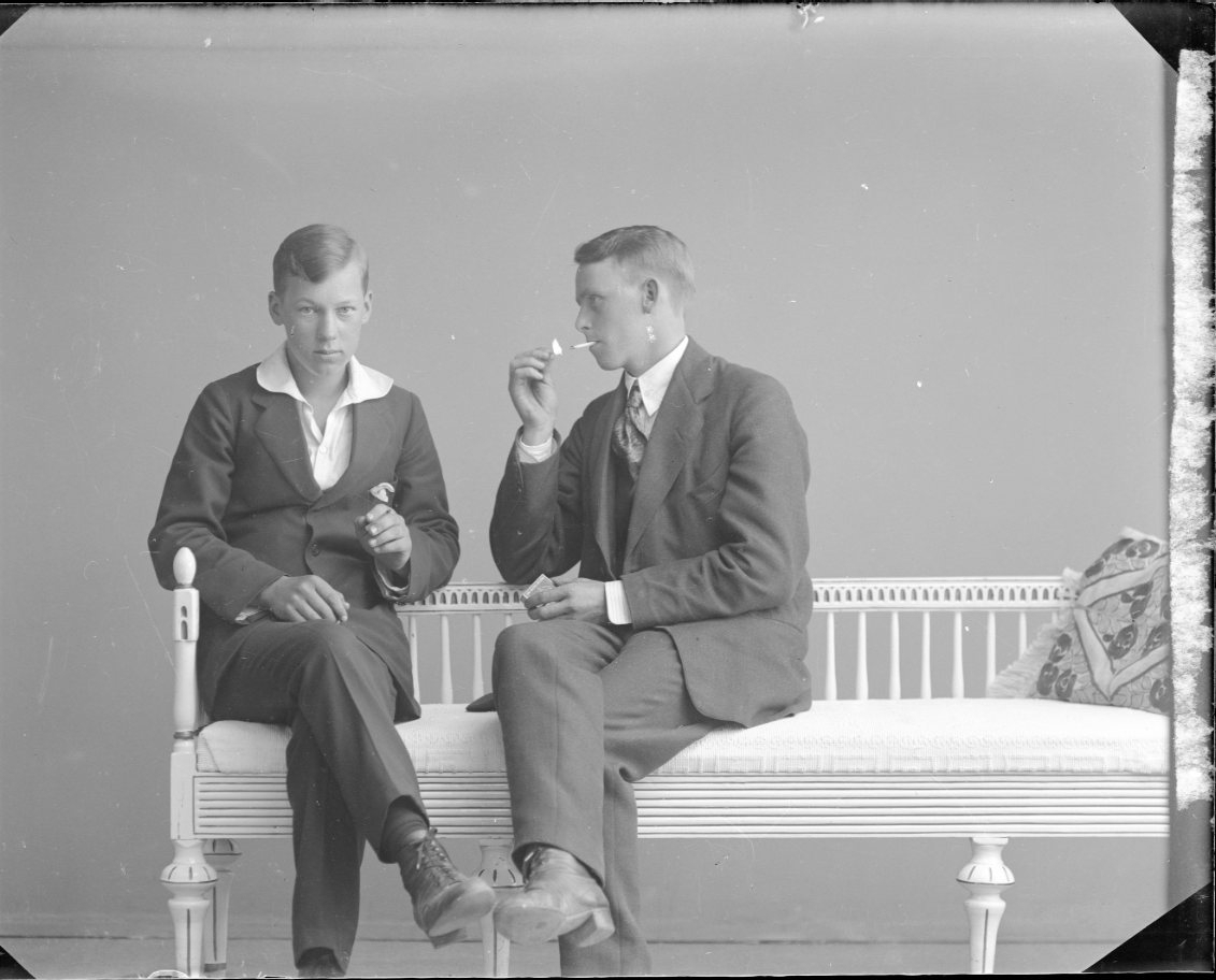 Gruppbild med två unga män som sitter i en soffa. En har en cigarett i handen, den andre sitter vänd mot den första och tänder en cigarett.