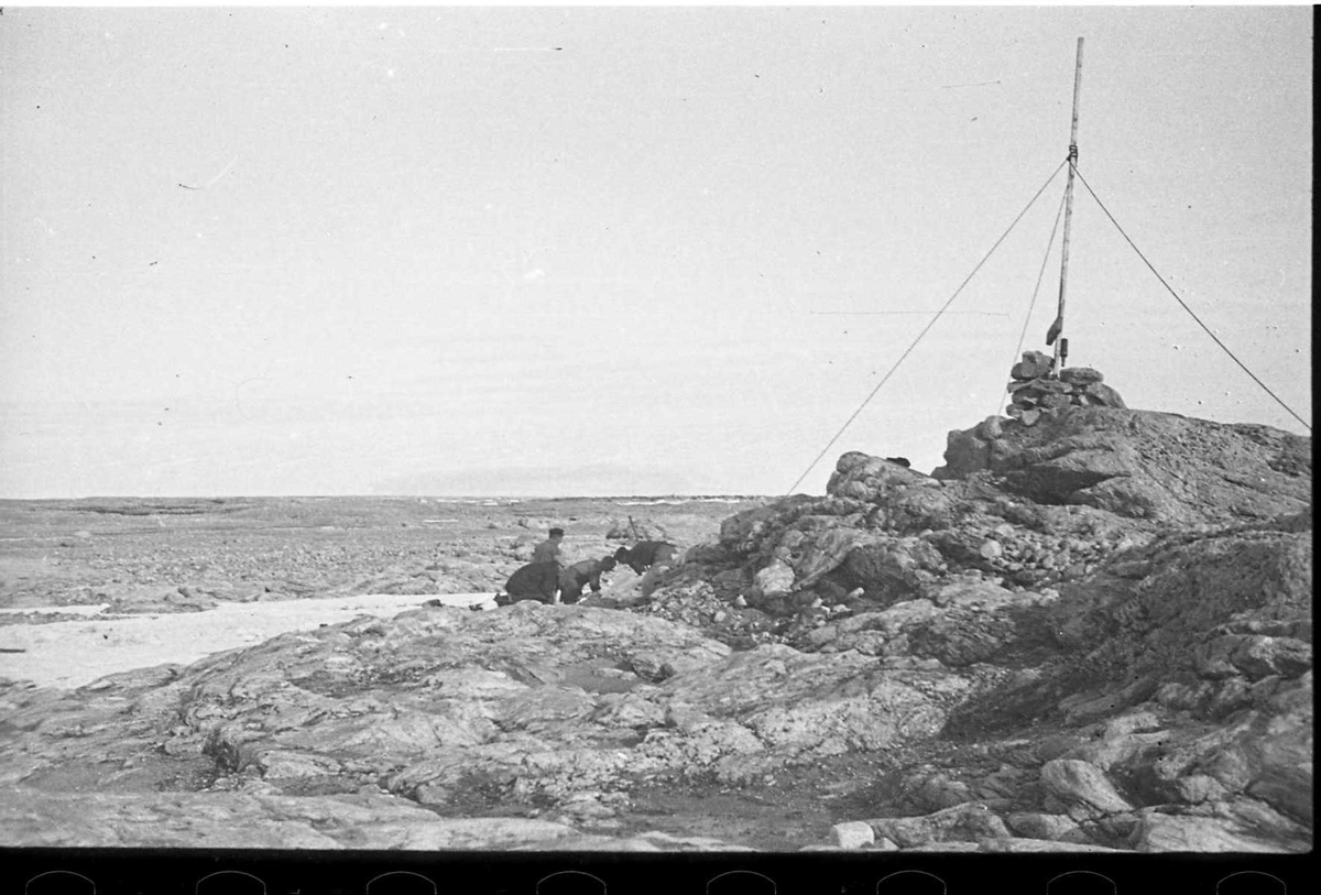 Titel: Besättningsmän från Isbjörn i arbete med utgrävning av Andréeläget på Vitön. Till höger Horns varde som markerade platsen för fyndet.