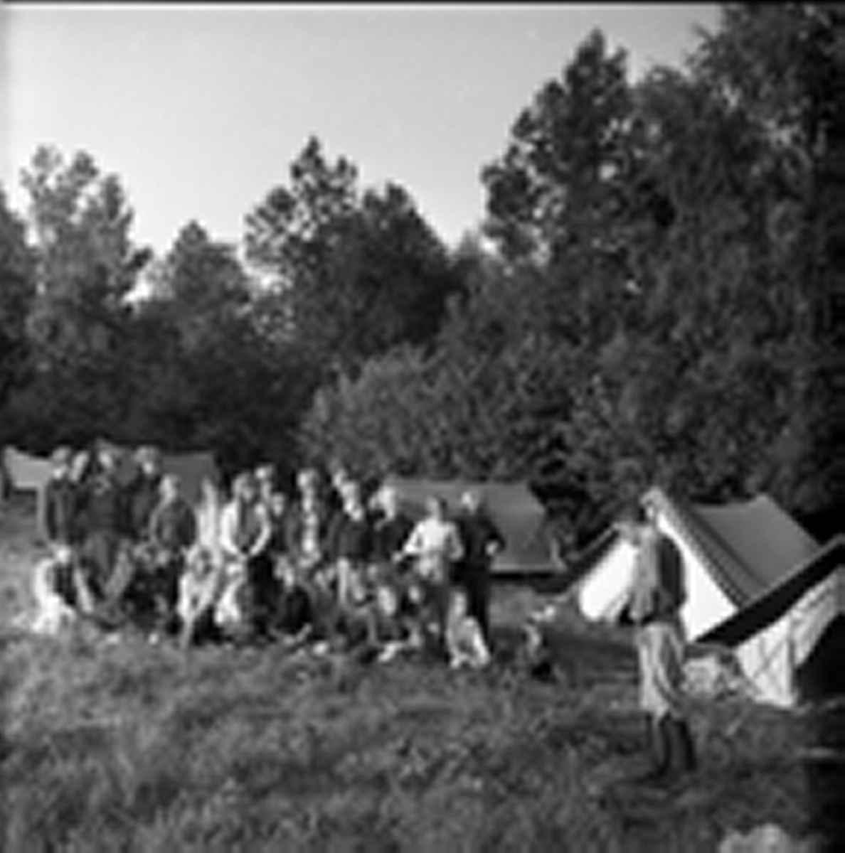 Några ungdomar och barn står uppställda för fotografering. De tittar på en man som stå och gestikulerar. I bakgrunden syns uppslagna tält.
