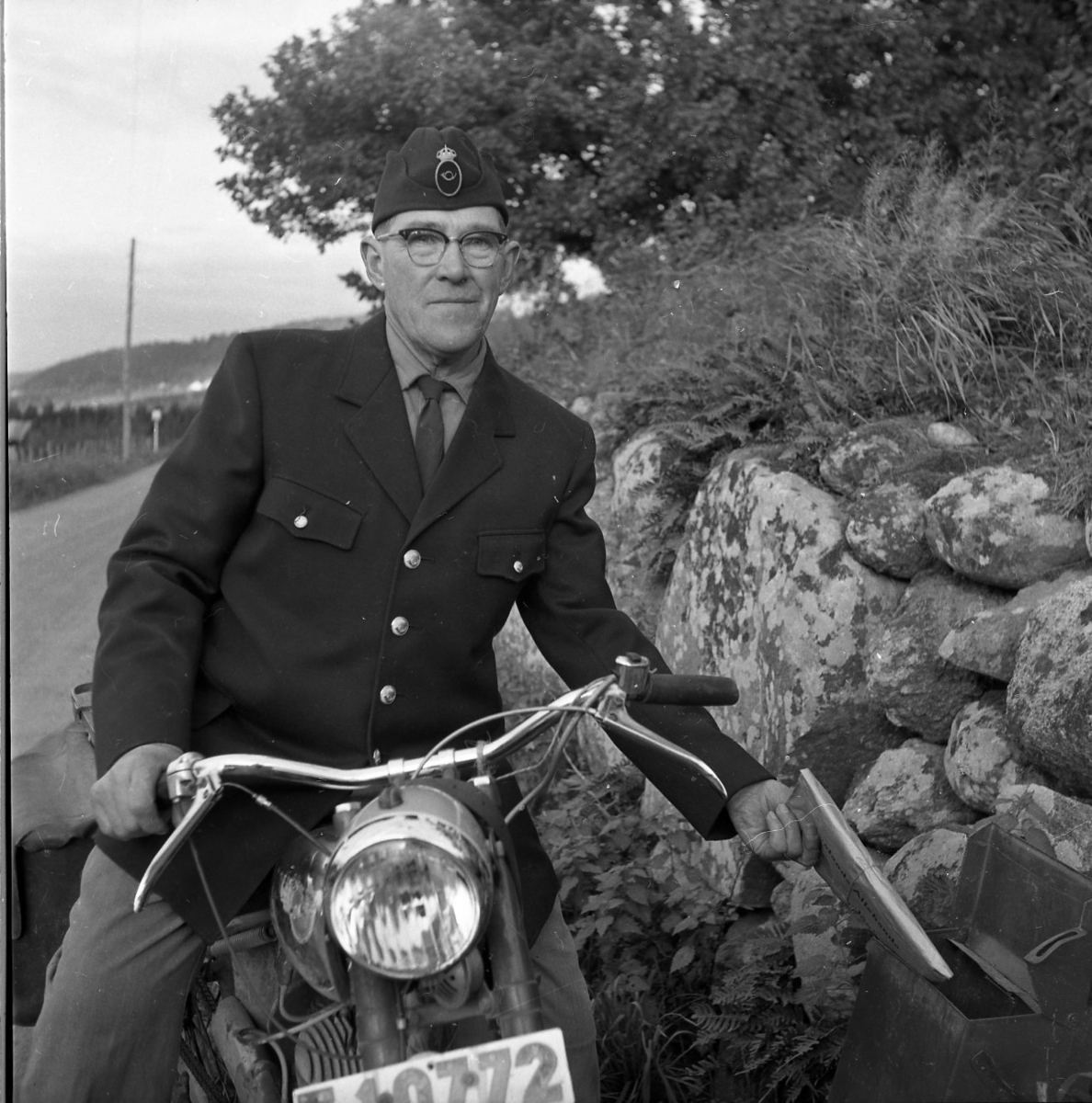 En man sitter på en moped. Han lägger ett paket i en postlåda. Han bär en postmössa med postens emblem längst fram.