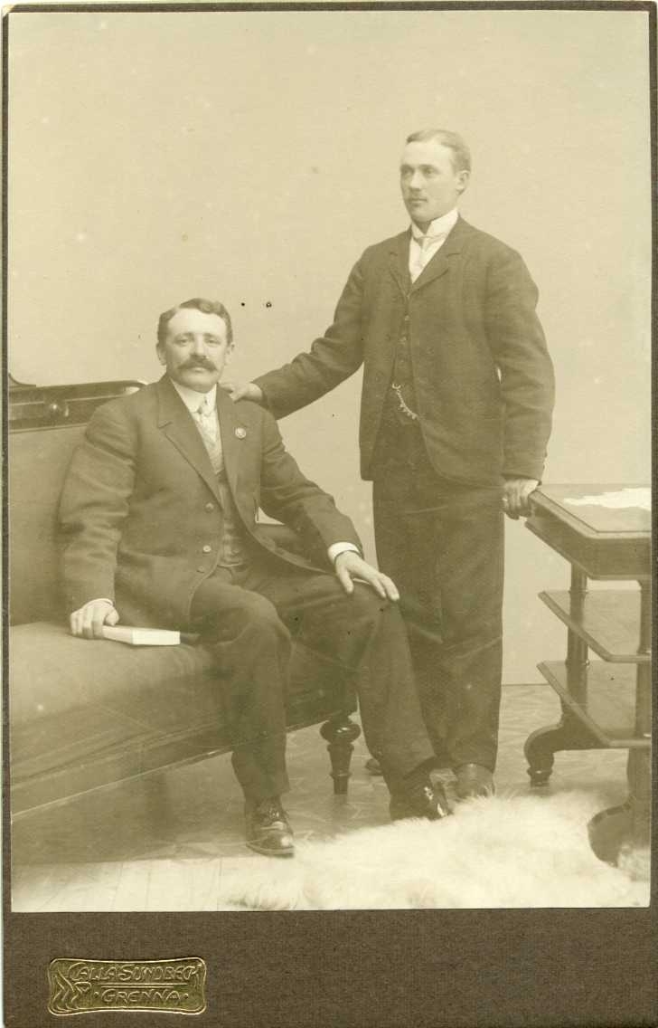 Kabinettsfotografi: två män varav den äldre - med stor mustasch - sitter i en soffa. Den yngre står med sin högerhand på den andres axel.