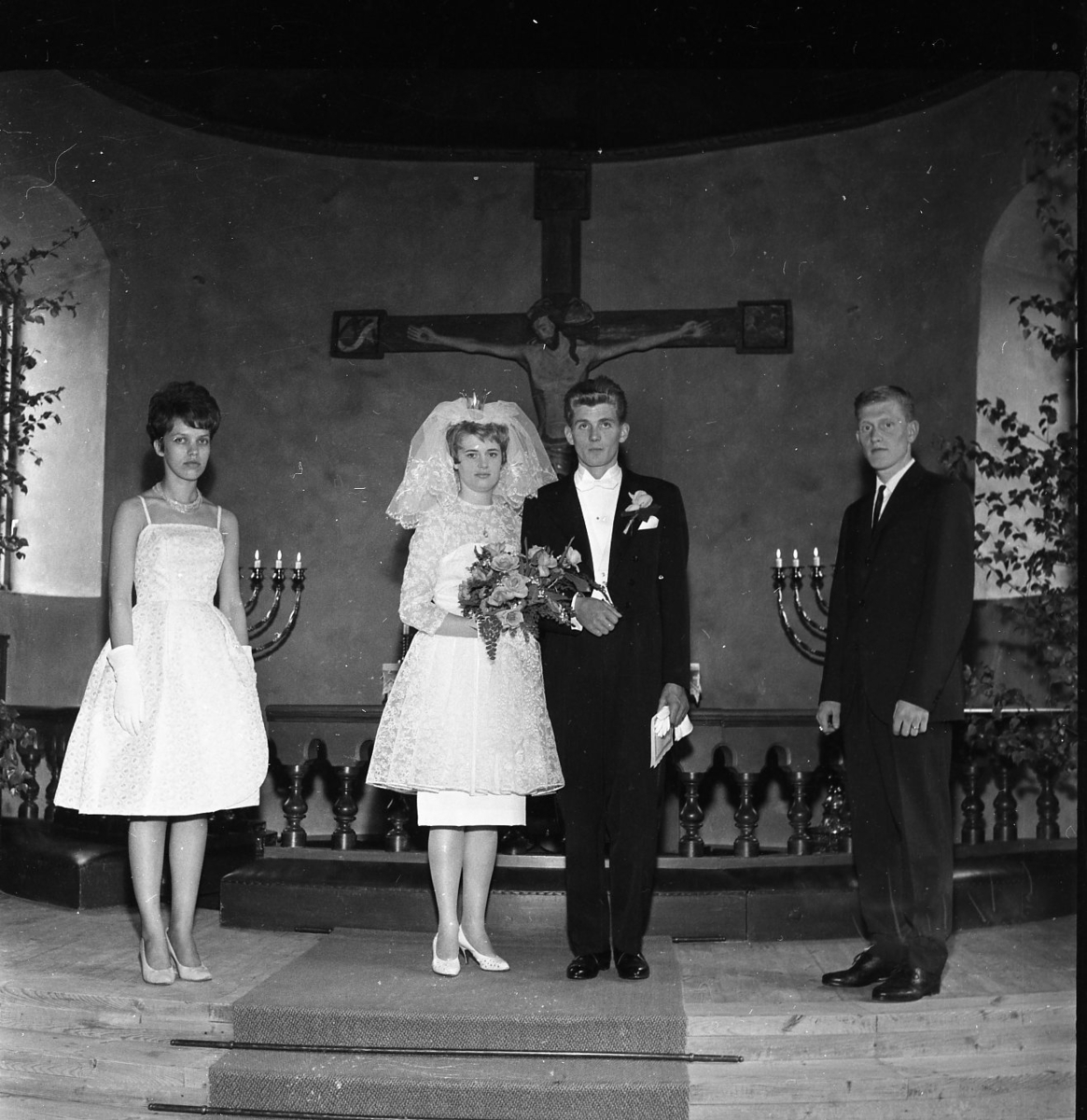 Ett brudpar står vid koret i en kyrka. Bakom dem hänger ett triumfkrucifix. På vardera sida om dem står en brällopsmarskalk och en brudtärna.