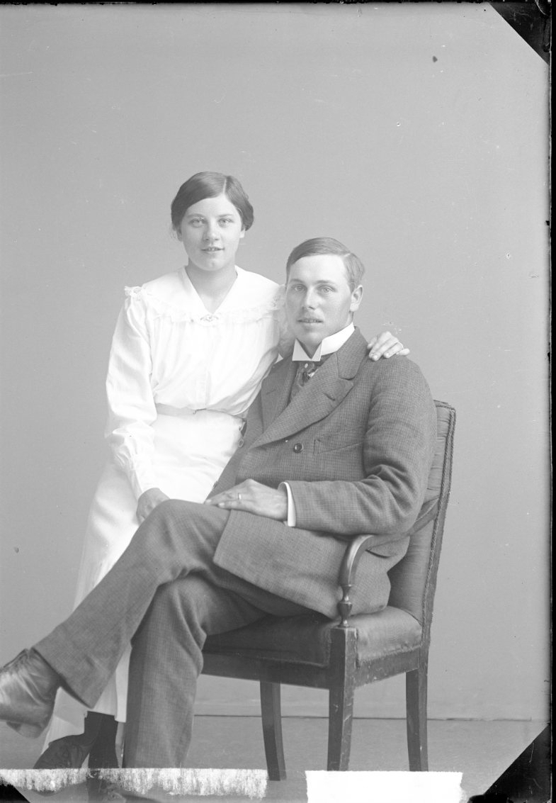 Gruppbild med en ung kvinna och man. Han sitter i en fåtölj och hon på armstödet med höger arm om hans hals.