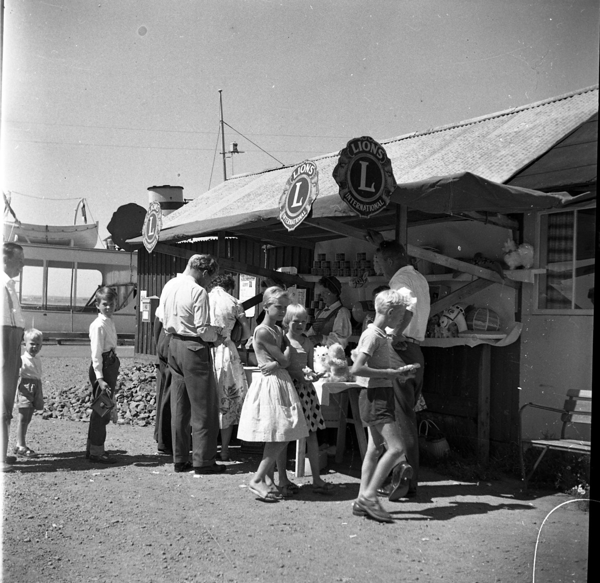 Titel: Barn och vuxna vid ett lottstånd i Gränna hamn. Lottståndet har en skylt för Lions. En färja ligger vid kaj i bakgrunden. Sannolikt marknad i Gränna Lions regi. En man håller en pojke i handen. Det är sommar och varmt.