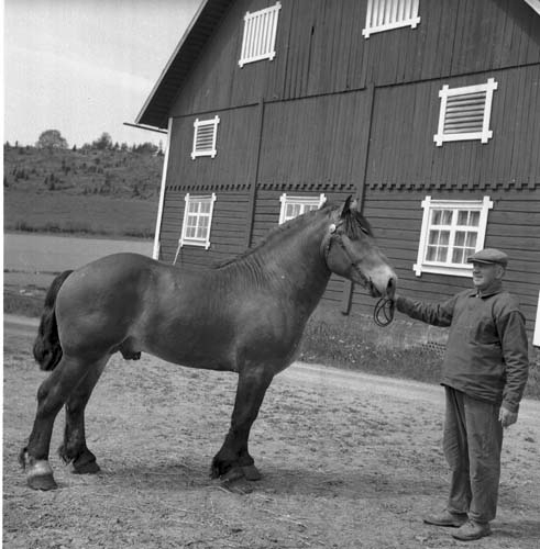 Vilbert Fredriksson står och håller i grimman på en häst.