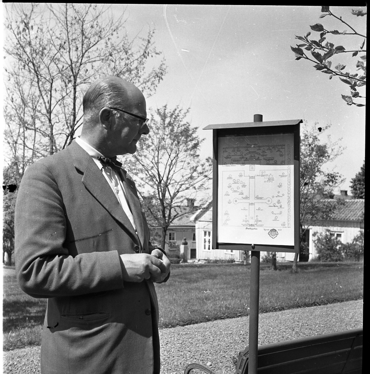 Titel: En man, med fluga, står i Braheparken i Gränna vid en skylt som åskådliggör parkens planteringar. Skylten har Gränna Lions som avsändare. I bakgrunde skymtar kv Hjorten 3.