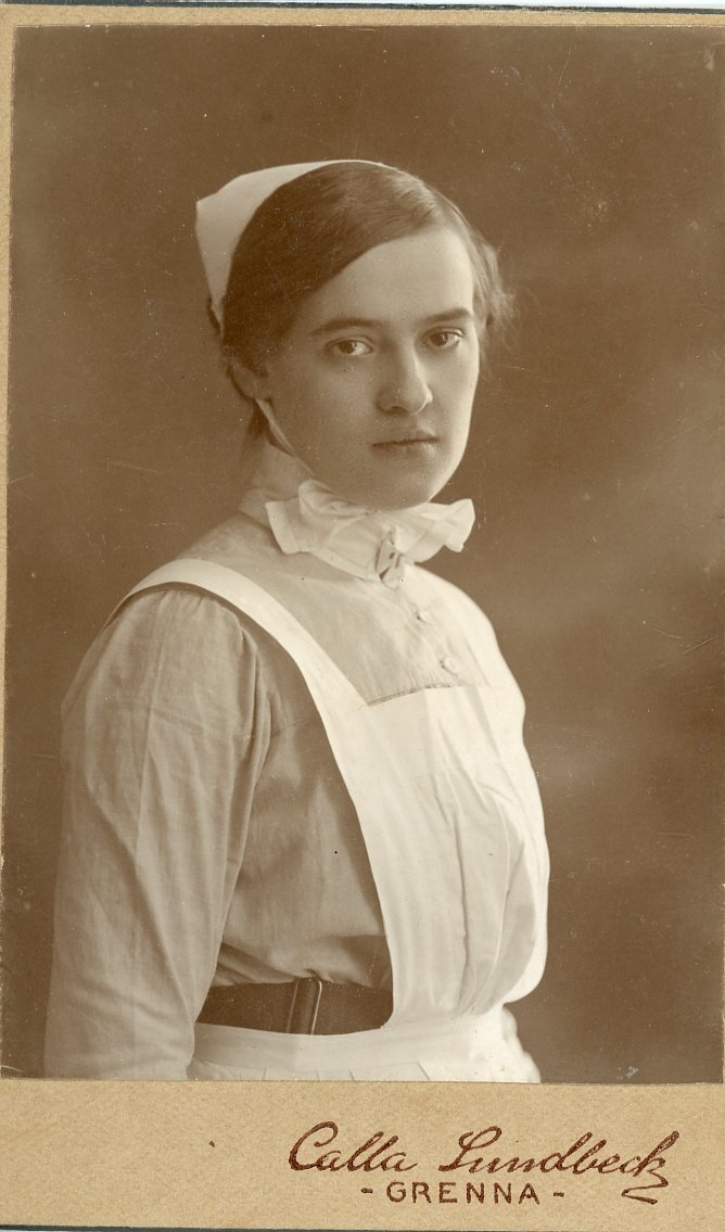 Kabinettsfotografi av en okänd ung kvinna i sjuksköterskedräkt.