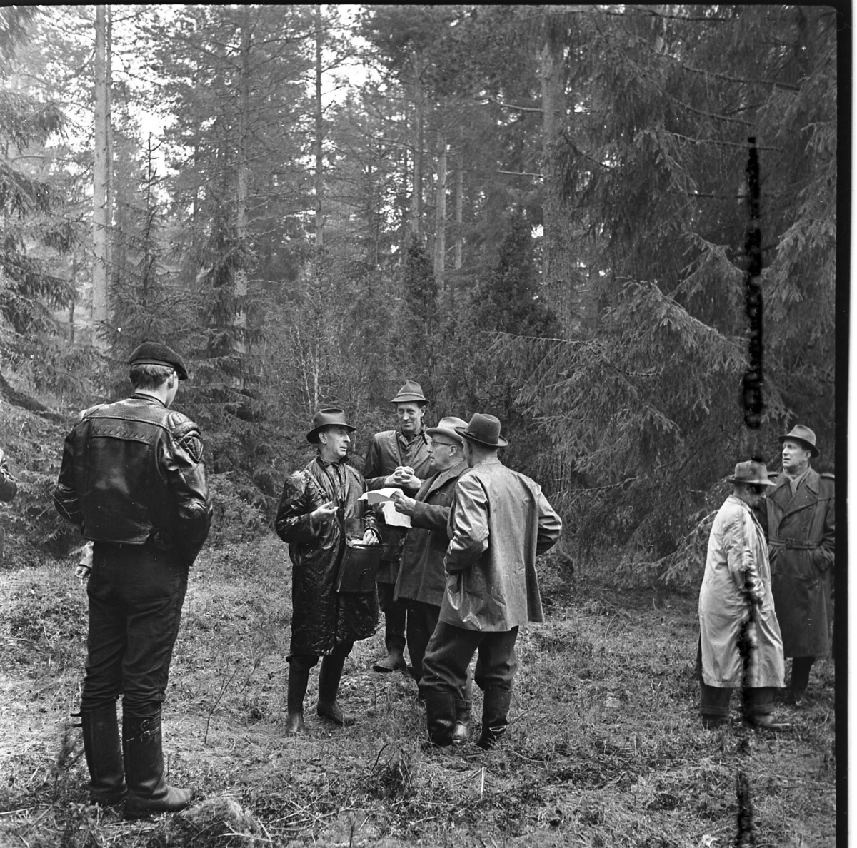 Några män iklädda regnrockar står och diskuterar någonting. De befinner sig i en skog.