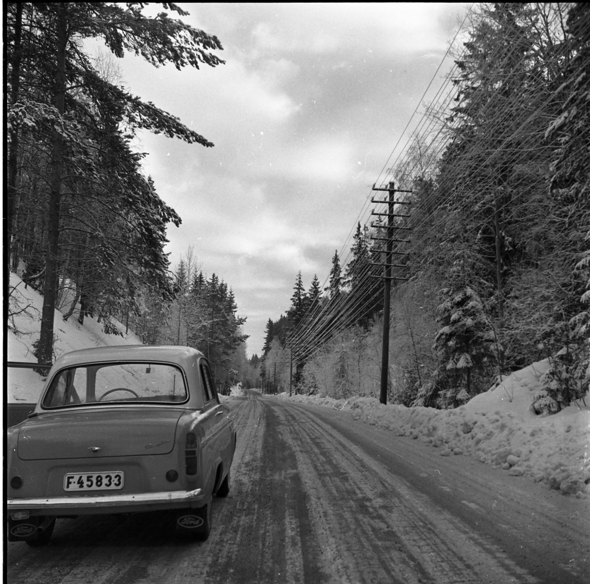 Vinterlandskap. En bil står vid sidan av en landsväg. Ingerydsdalen mellan Bröttjemark, Ölmstad och Bunn. Bilen har reg nr: F 45833.