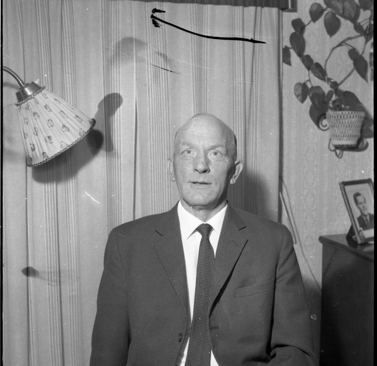 Porträtt av en man som sitter i en hemmiljö. Han bär kavaj och slips.