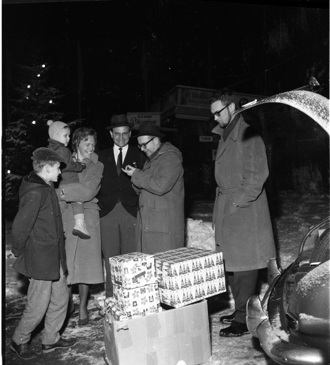 En man med mikrofon står och intervjuar två vuxna människor. En kvinna bär ett barn på höften. Bredvid dem står en pojke. Framför dem står en låda med paket.