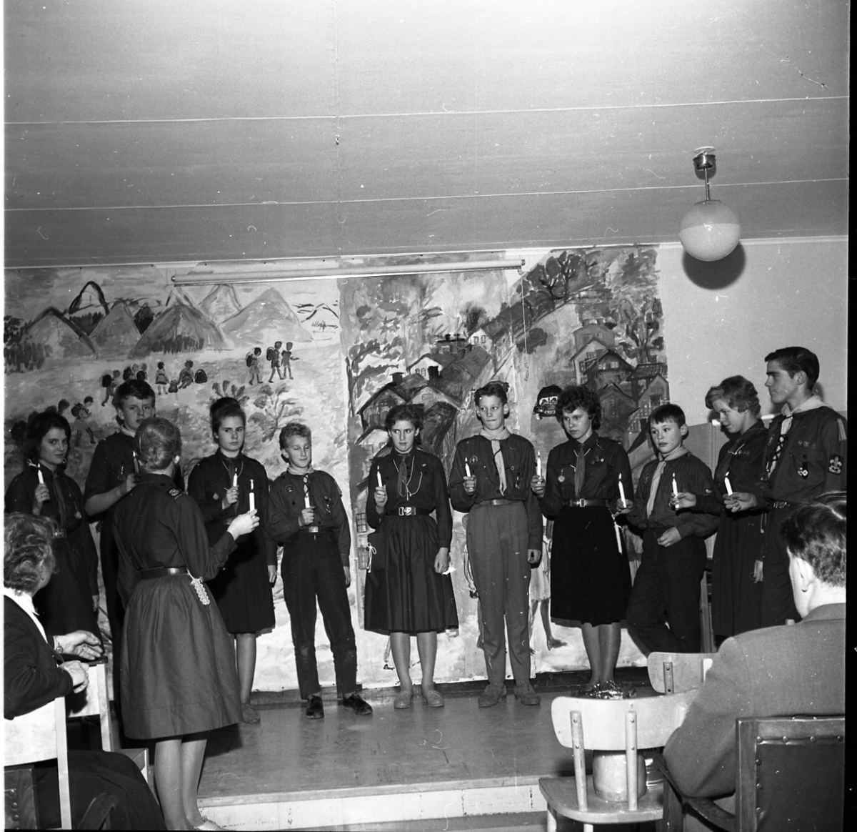 Scouter är uppställda på rad på en scen. De håller varsitt levande ljus i händerna.