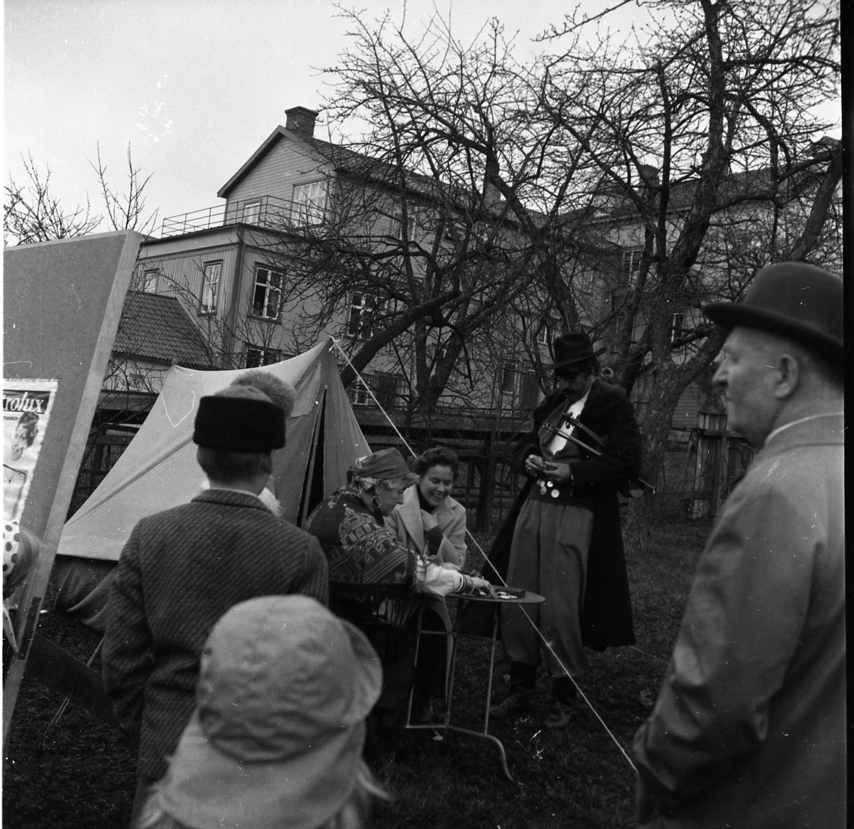 En folksamling vid ett tält med en spågumma, Anna-Lisa Lundin med den kvinnlig kund Anna-Lisa Palm. Intill står Olle Mathias som "zigenare" med fiol under armen. De befinner sig på norra delen av Sjögatan i Gränna.