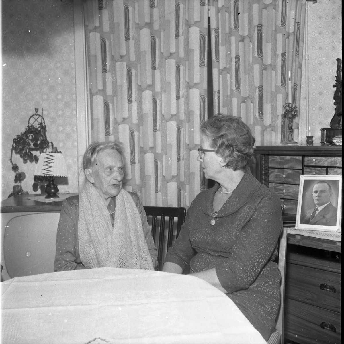 En äldre dam sitter i en hemmiljö och pratar med en något yngre dam. Ett porträtt av en man står på chiffonjen bredvid dem.