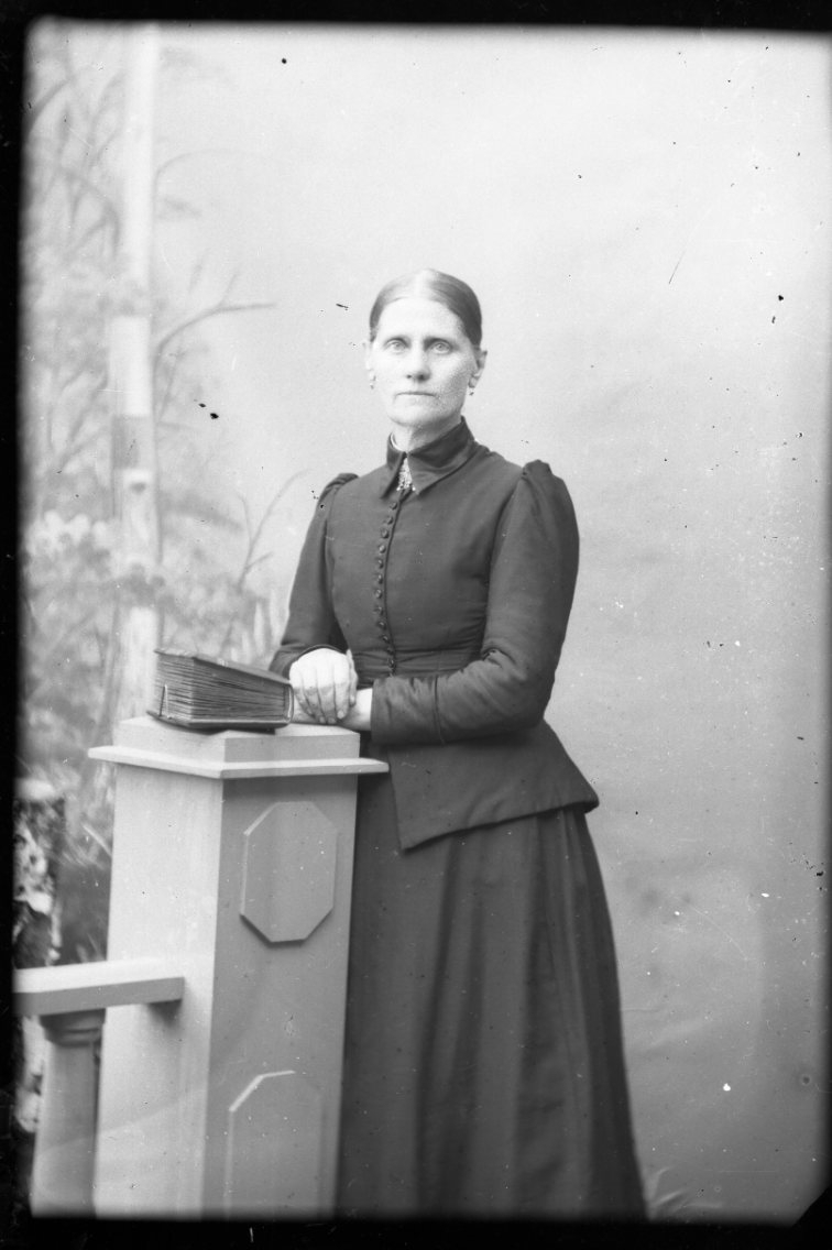 Porträtt av äldre kvinna som med händerna vilande på en staketstolpe. På stolpen ligger också sannolikt ett fotoalbum.
