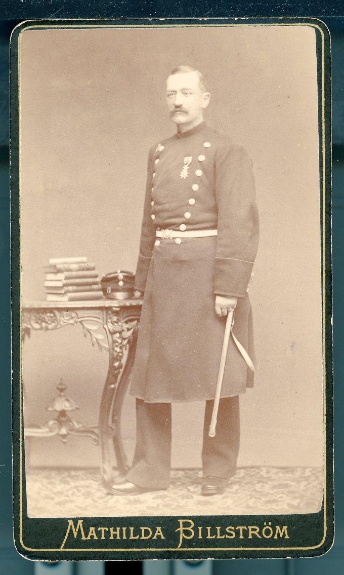 Kabinettsfotografi: A W Hall i helbild i uniform med medalj på bröstet. Mössan på ett bord intill bredvid en trave böcker.