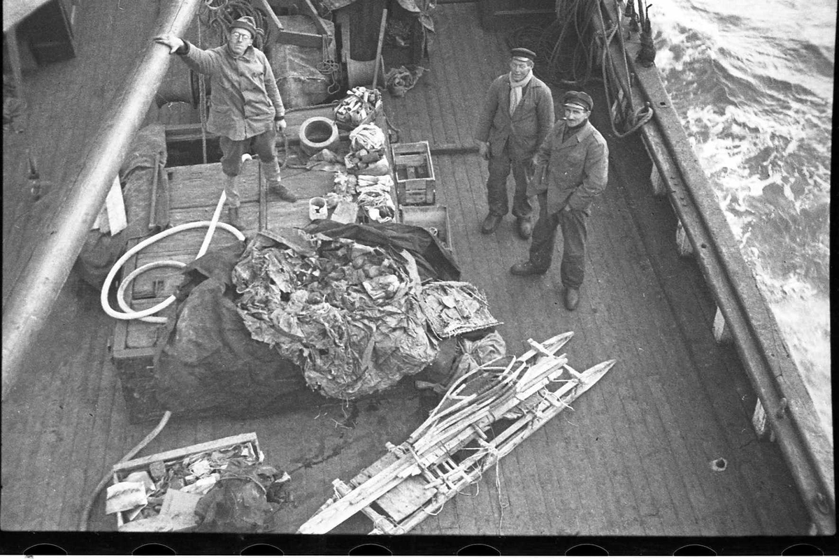 Fynd från Vitön ombord på Isbjörn. P W Zapffe till vänster.