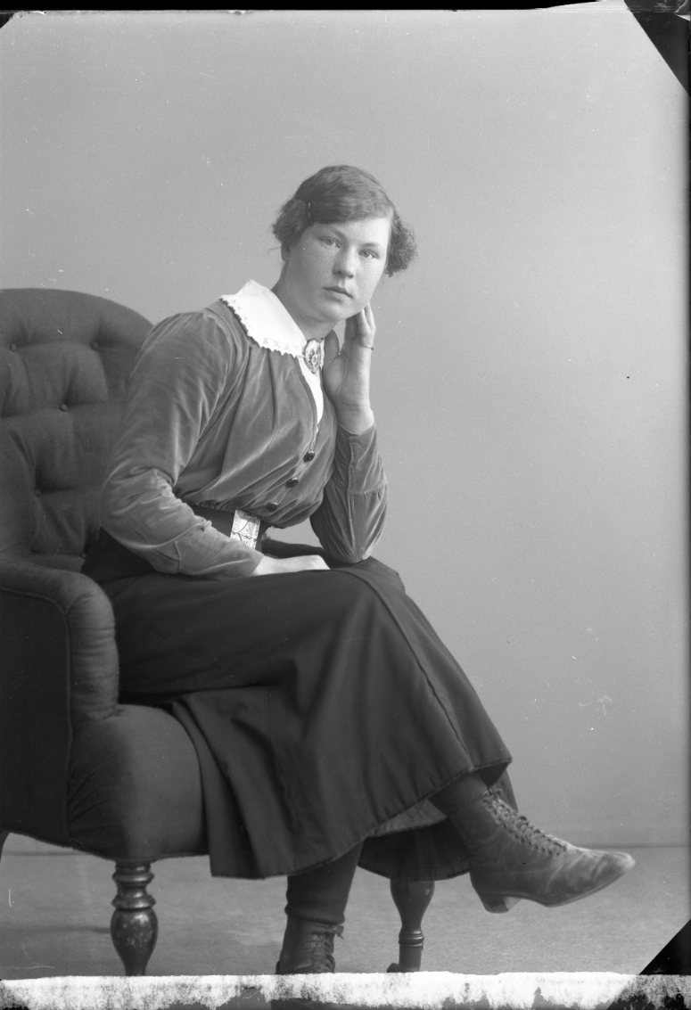 Porträtt av en ung kvinna som sitter lite framåtlutad i en fåtölj, vilar kinden i vänster hand.