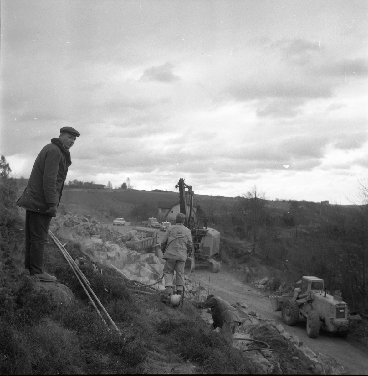 Grävmaskin och andra vägmaskiner i arbete vid Galgen i samband med motorvägsbygget vid Gränna/Röttle, etapp II. En okänd man står på en höjd till vänster och tittar mot fotografen. Vid huset står en polisbil - Volvo Amazon.