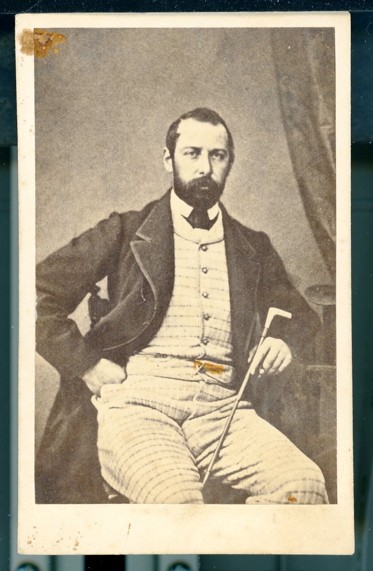 Kabinettsfotograf: okänd sittande man i rutiga byxor och väst samt mörk rock. Håller en spatserkäpp i vänsterhanden.