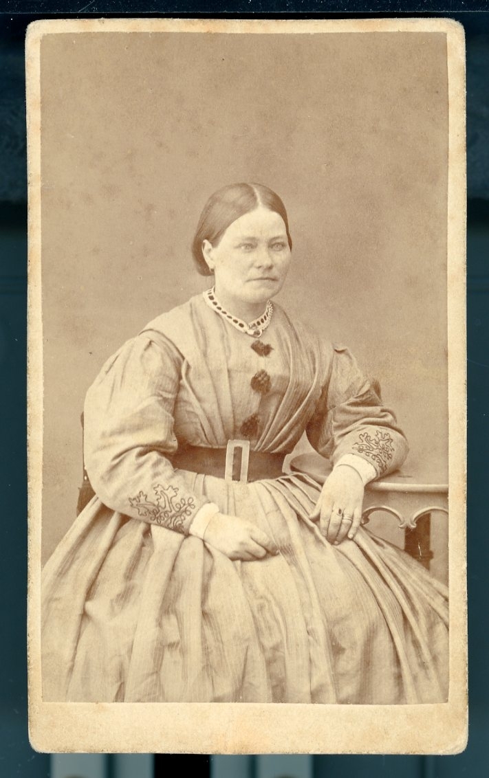 Kabinettsfotograf: Lovisa Mozart sittande vid ett bord. Smalrandig klänning med vida ärmar och broderier längst ned, brett skärp.