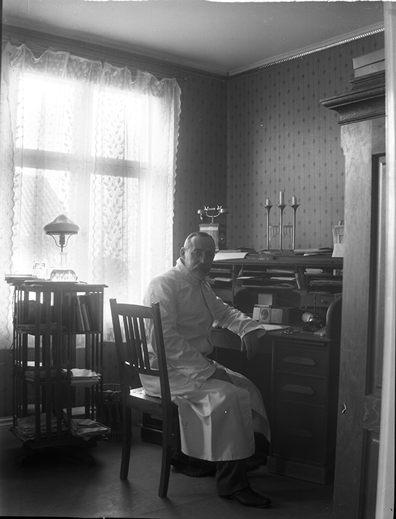 Doktor Werner i läkarrock vid skrivbordet på Brahegatan 20.