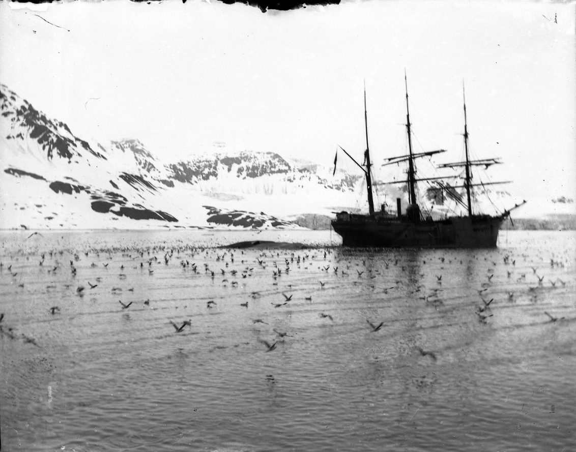 Ett oidentifierat troligen norskt tremastat ångfartyg vid Spetsbergen. En mängd fåglar i vattnet och runt fartyget. Snöklädda berg i bakgrunden.