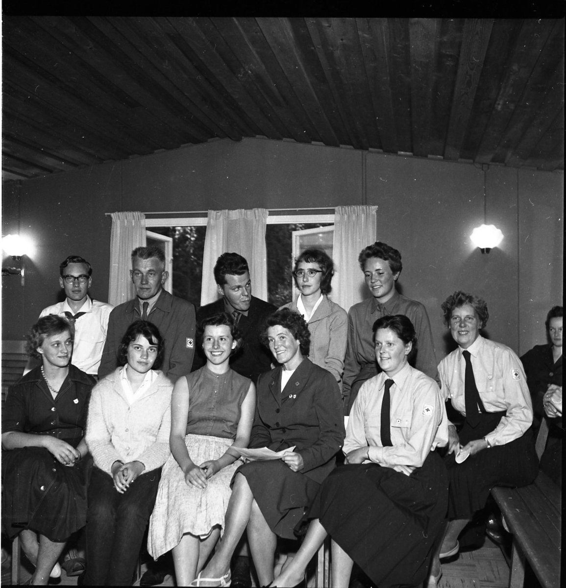 Kvinnor och män sitter på rad och poserar för fotografering. Några bär vit skjorta med ett rött kors på armen.