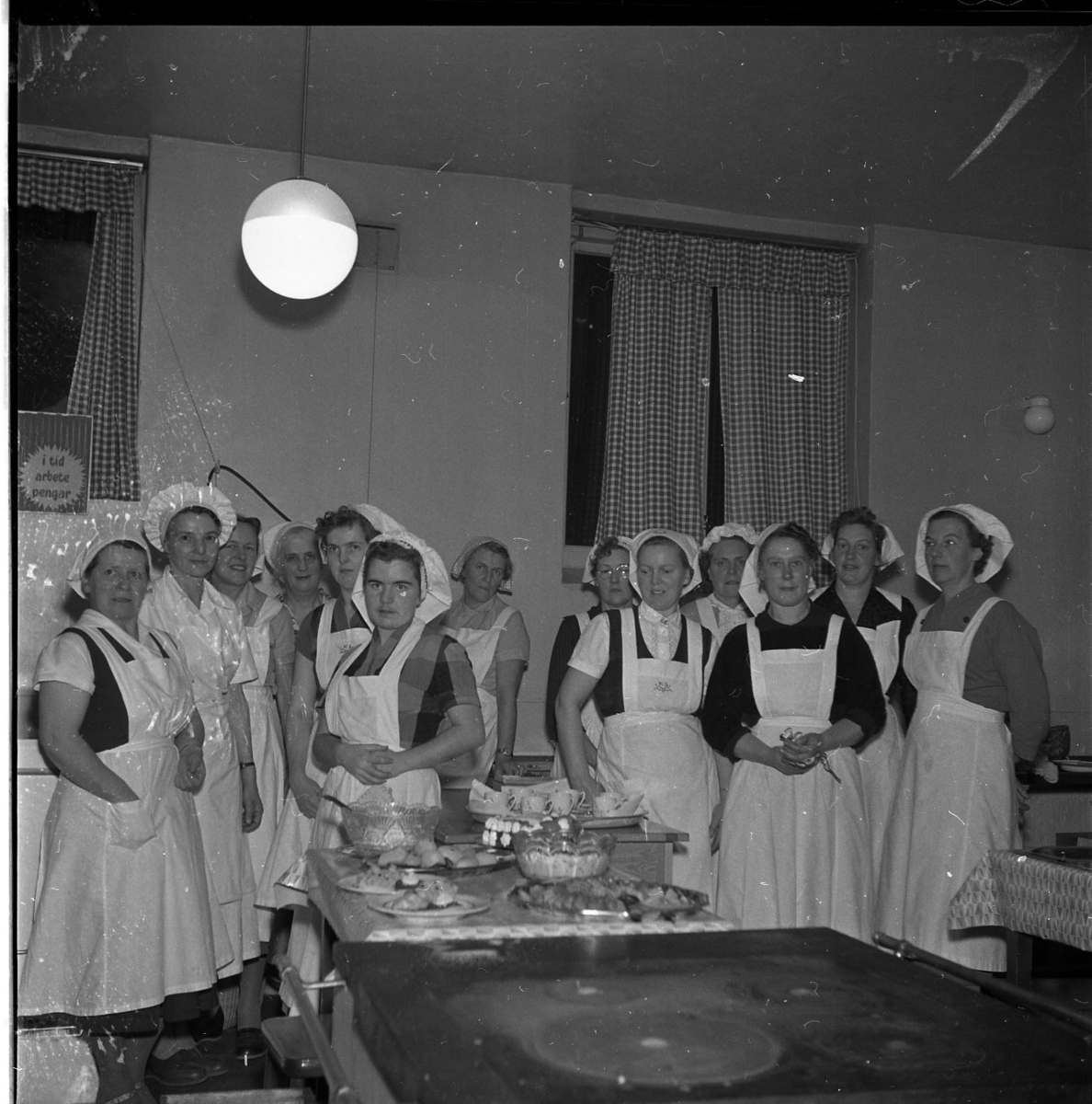 Tretton kvinnor med huckle och förkläde står samlade bakom en stor järnspis i ett storkök. Etta fr vänster är Ebba Axelsson, 5:a Kerstin Isaksson, därnäst Ingelis Bernersson. Till h§ger Berta Callerstig och 5:a fr höger Märta Selin