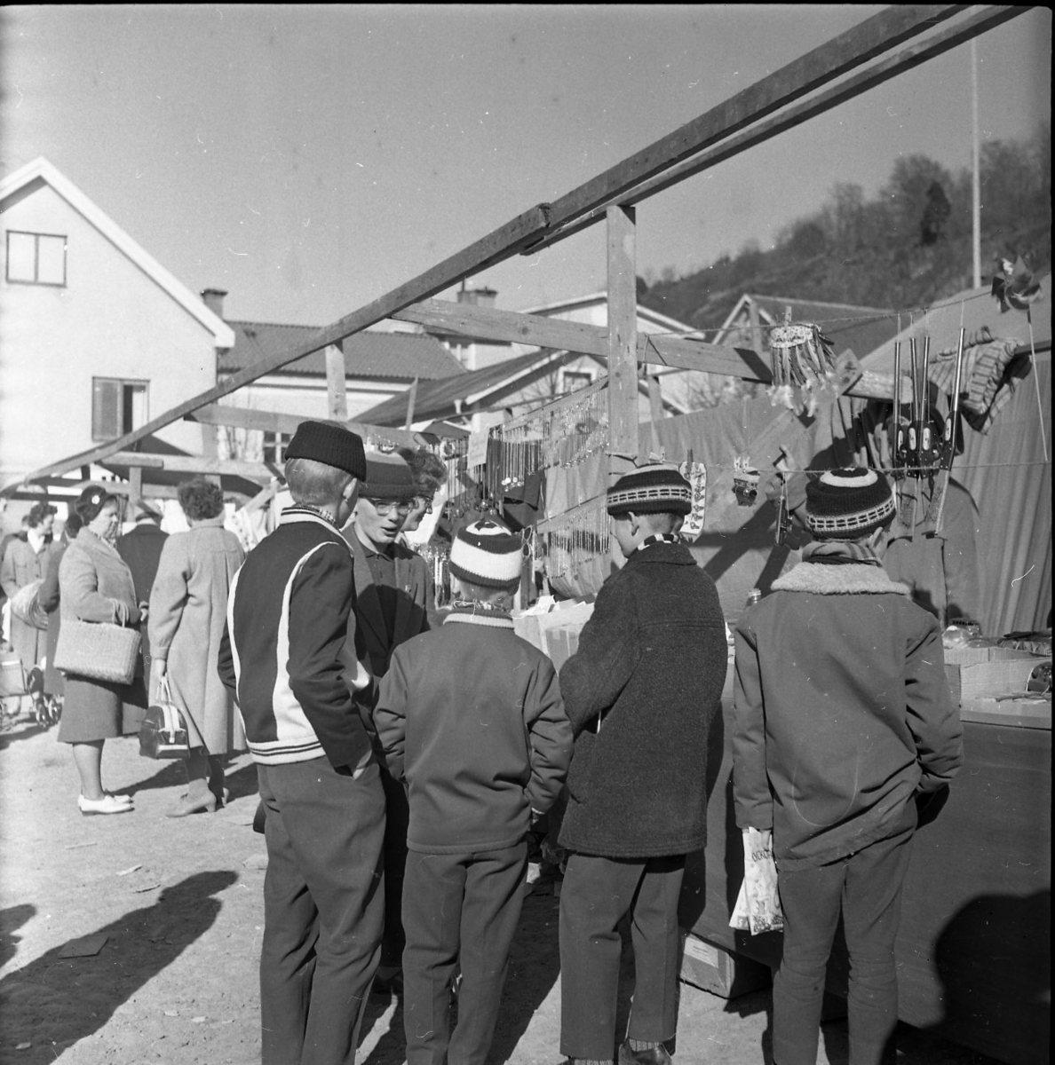 Fem pojkar iklädda mössa står vid ett marknadsstånd och pratar och tittar på grejer till försäljning.