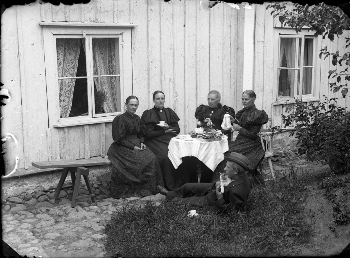 Kaffedrickande i en trädgård. Fyra kvinnor sitter runt ett bord med kaffekopp i händerna, en man med hatt ligger på gräsmattan intill med en katt i famnen. En kaffekopp står i gräset intill honom. Kvinnorna till vänster och höger är möjligen systrarna Grönberg.