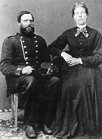 Gruppbild med det paret Wallin som sitter intill varandra på stolar. Mannen har skägg och är klädd i militär uniform.