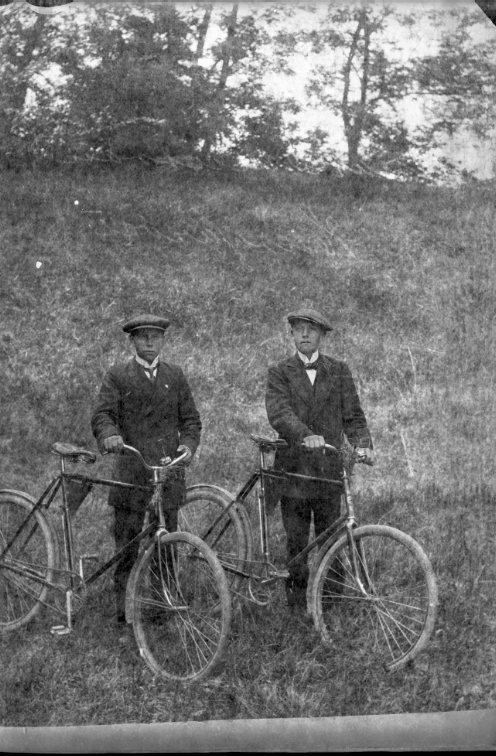 Två äldre pojkar med cyklar nedanför en grässlänt.