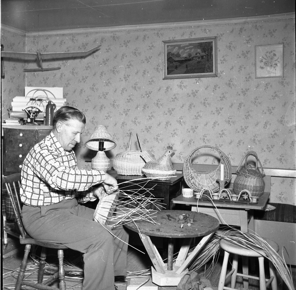 Porträtt av Algot Wallin som håller på att fläta en korg. Bakom honom syns flera utav hans alster. Tre flätade korgar, en lampa med flätad fot och skärm samt en äggkorg i form utav en höna.
