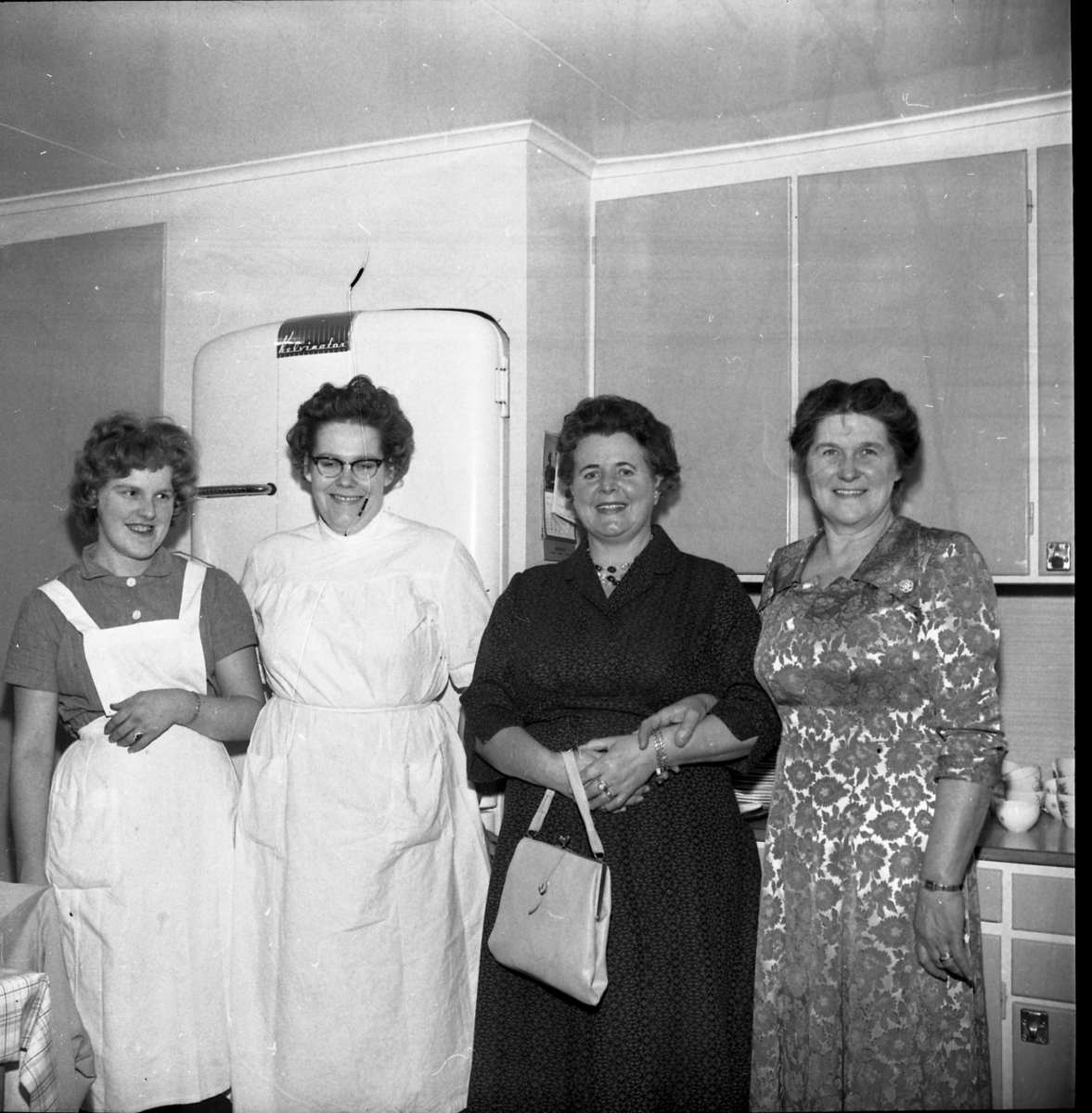 Fyra damer står uppradade i ett kök. Bakom sig har de en frys av märket Kelvinator. De har kortklippta, lockiga frisyrer. En kvinna bär ett vitt förkläde och en annan en vit särk. De andra två är klädda i mönstrade klänningar.