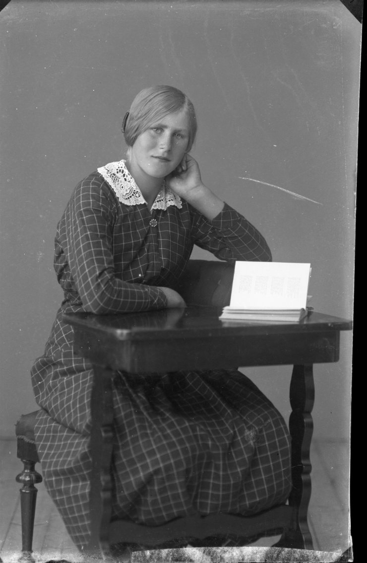 Porträtt av en flicka i rutig klänning med ljus spetskrage. Hon sitter vid ett bord med en uppslagen bok.