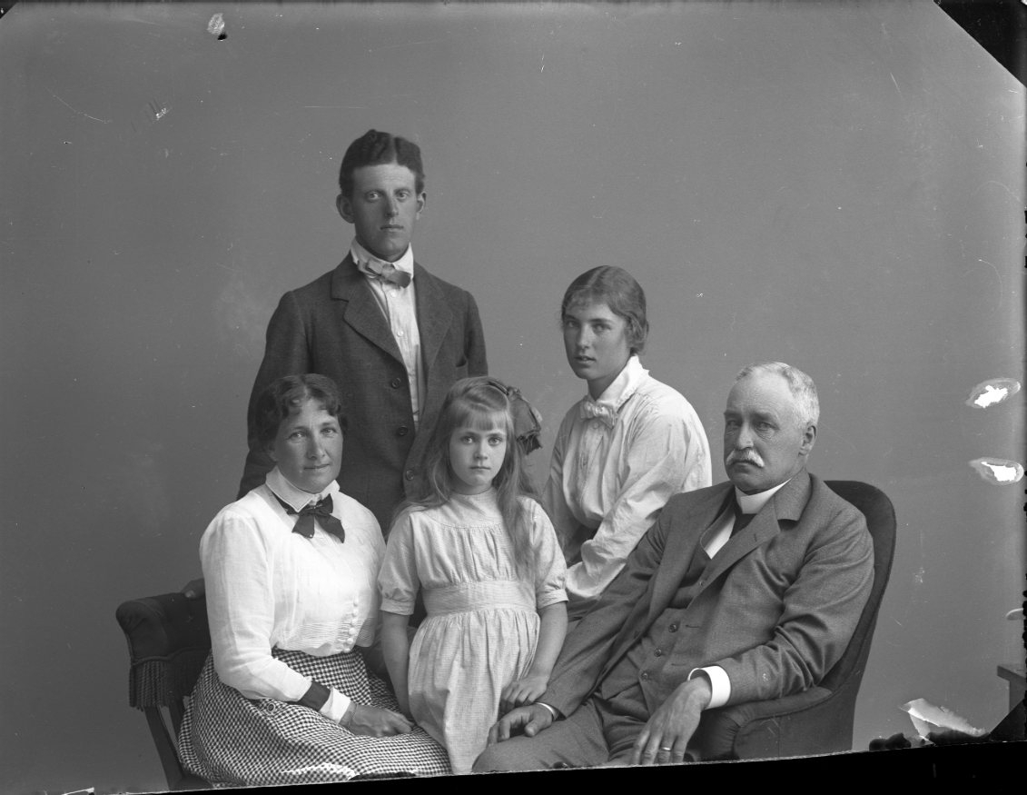 Familjeporträtt med man, kvinna och tre barn i olika åldrar.